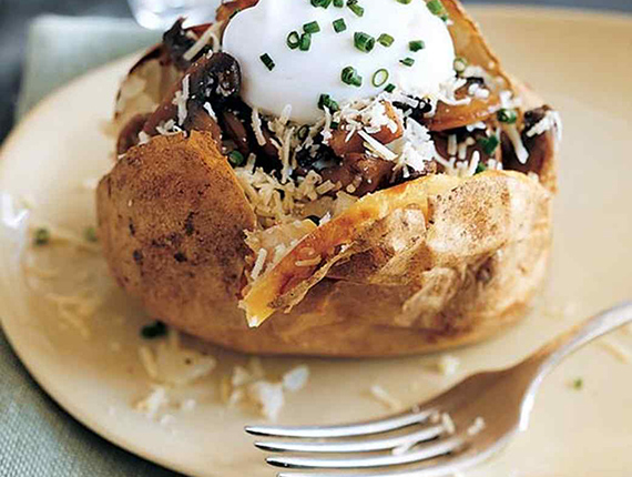 - سیب زمینی ها رو از بالا شکاف بزنید و با کمی فشار اون رو باز کنید. قارچ های تفت داده شده و پنیر چدار رو بین سیب زمینی ها تقسیم کنید. روی هر سیب زمینی مقداری ماست بذارید و روی اون ها پیازچه خرد شده بریزید.